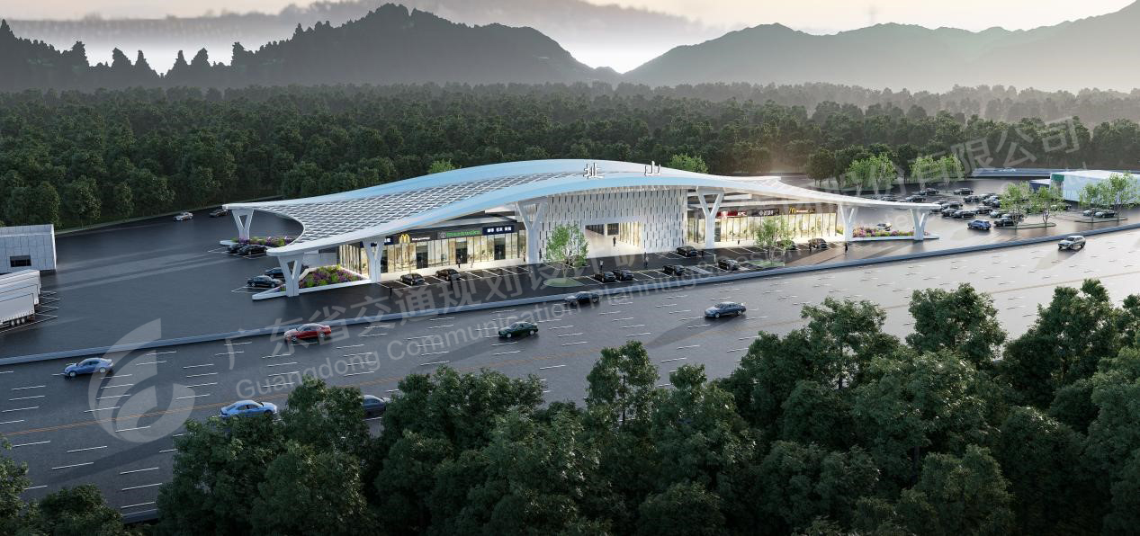 址山服务区是佛开高速南段改扩建工程项目的一部分,认真贯彻落实省交通集团“十四五”发展规划和服务区“一路一策、一区一品”建设理念工作部署和要求,整体布局设计借鉴机场航站楼模式,将充电设施与服务楼作一体化设计,凸显新能源服务区的新型设计特色。