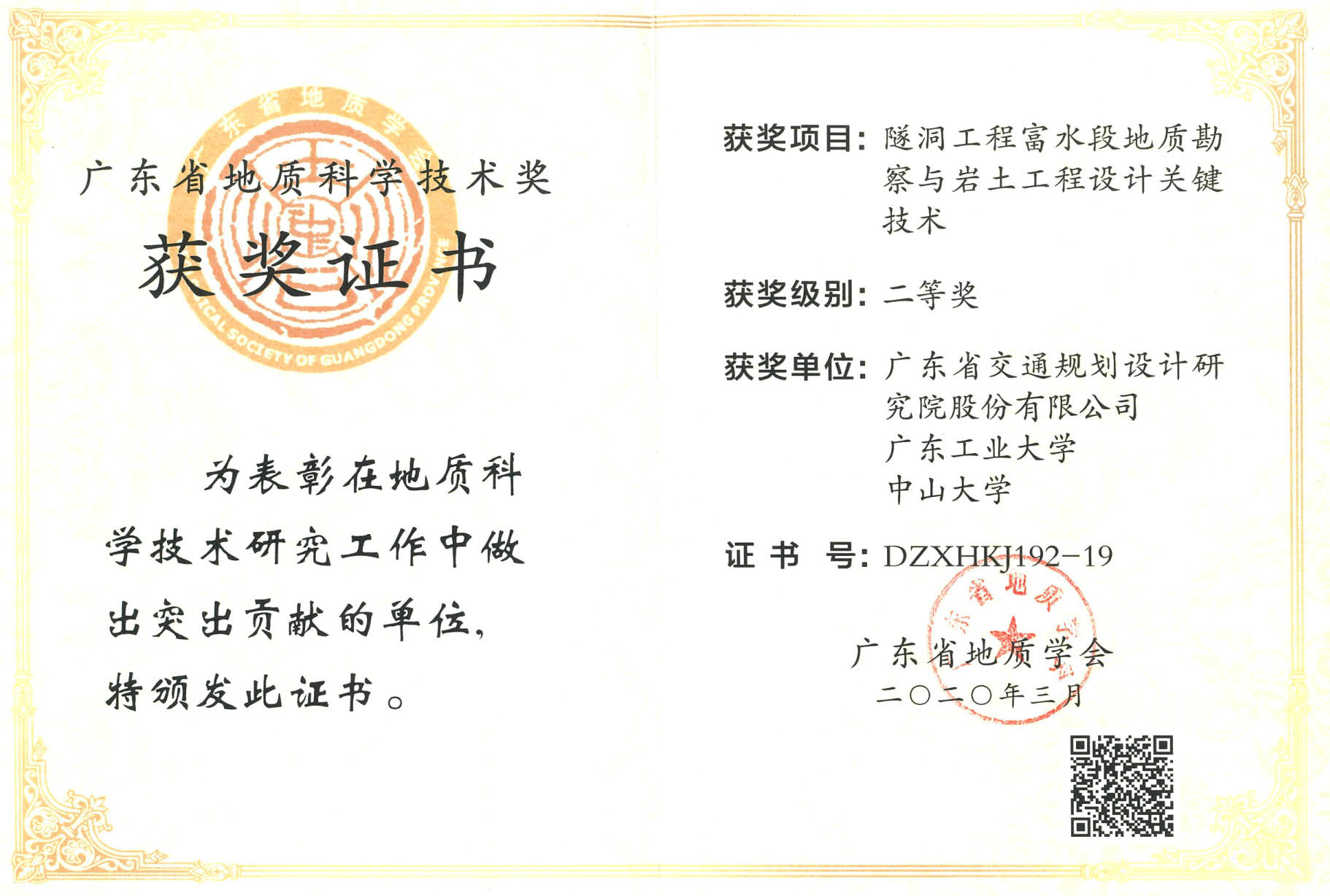 近日,公司在“2019年度广东省地质学会科学技术奖”评选中喜创佳绩。公司作为第一单位共有两个项目获奖,其中“路桥隧工程的典型地质问题识别与处置关键技术”荣获一等奖,“隧洞工程富水段地质勘察与岩土工程设计关键技术”荣获二等奖。两个获奖项目的承担部门均为岩土勘察分院。