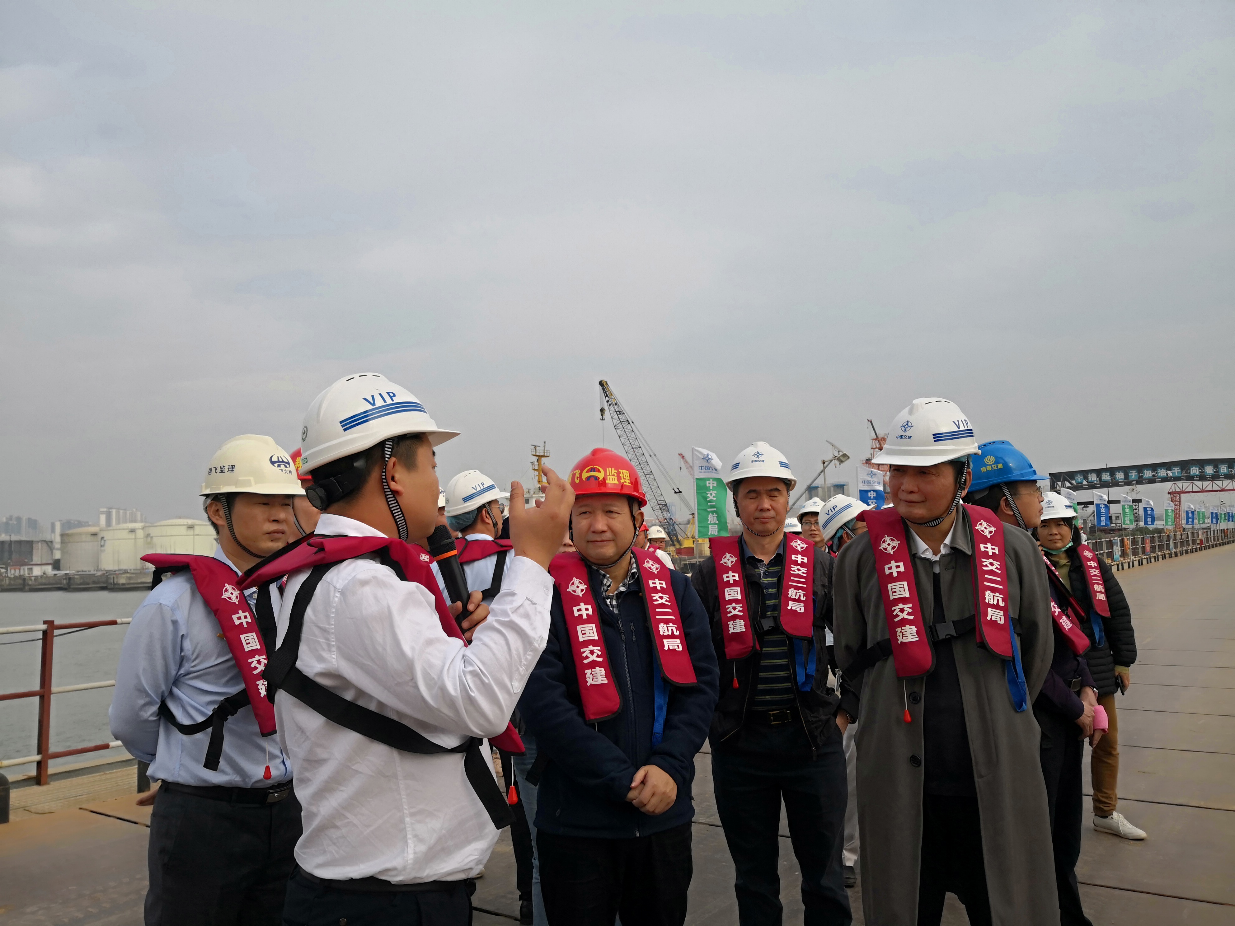 首先,大家前往东江南支流港湾大桥项目地进行参观学习。通过中交二航局项目经理游川的详细讲解,我们了解到本项目主桥为主跨320m的自锚式悬索桥,跨度居国内前列,首次采用“临时锚碇法”进行主桥上部结构“先缆后梁”施工,解决了自锚式悬索桥“先缆后梁”施工的诸多技术难题,为我国桥梁工程施工建设提供了重要理论依据和实用技术。作为项目监理方,我们的监理技术和手段随着施工工艺的更新而不断迭代升级,为项目建设质量保驾护航。“一桥飞架南北,天堑变通途”,作为项目建设者,我们倍感骄傲!