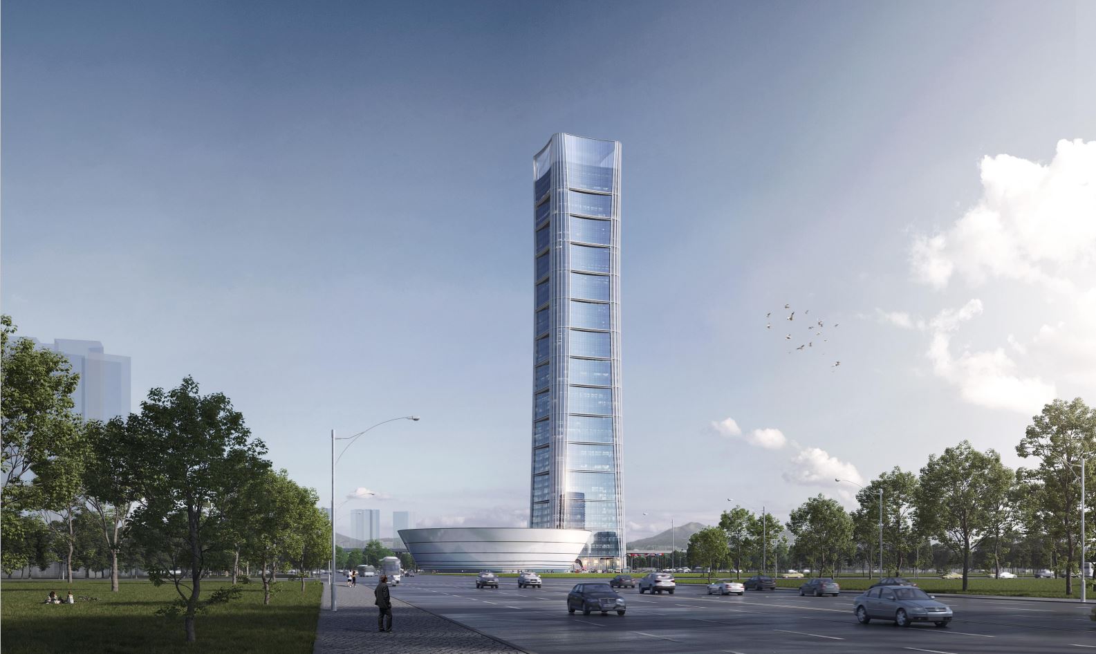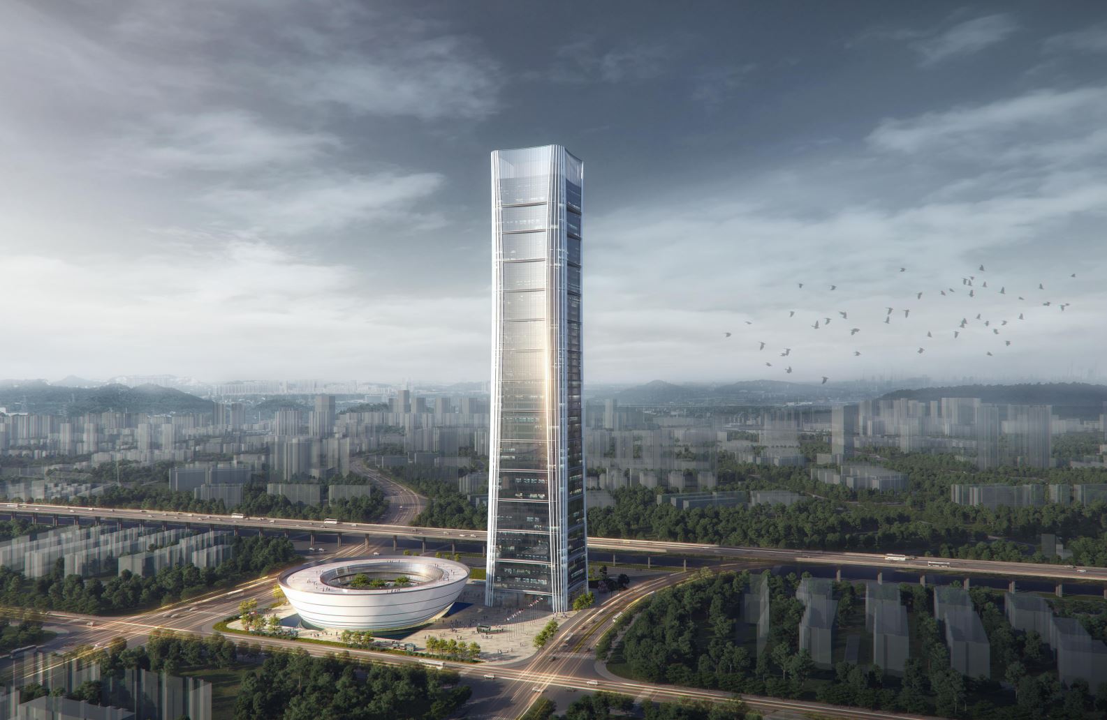 “湾区之源”方案以“天下万物生于有,有生于无”为设计主题,由塔楼和裙楼两部分组成,长短相形,高下相倾,前后相随。塔楼功能以办公和商住为主,外立面造型灵感来自竹节,象征“生生不息,坚韧不拔”;裙楼平面布置可塑性强,可满足会议、会展、商演等多功能需求,形似容器,通体浑圆,寓意“包容并蓄,有容乃大”。同时,方案围绕“绿色、环保”进行了多项创新设计。